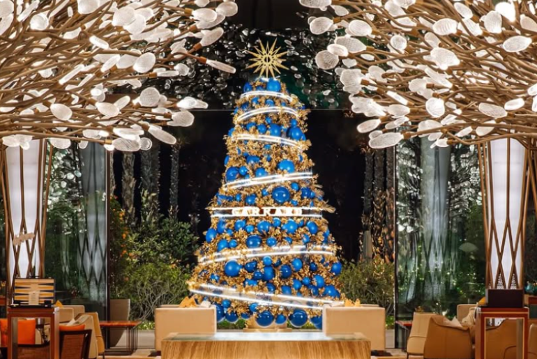 Khách sạn kỷ niệm 5 năm với cây thông lấy cảm hứng từ vàng và sapphire, tỏa sáng rực rỡ. Mở cửa tham quan hàng ngày đến ngày 31 tháng 12.