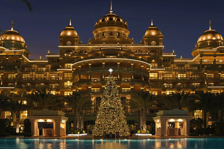 Khách sạn trưng bày hai cây thông: một cây với tông màu đỏ và vàng trong sảnh, và một cây với tông màu đỏ và trắng bên hồ bơi. Mở cửa tham quan hàng ngày đến ngày 31 tháng 12.